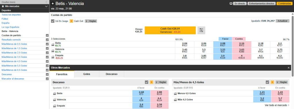 Por ejemplo, si quieres consultar el mercado del partido Betis – Valencia, simplemente haz clic en la barra correspondiente y se abrirá la pantalla con todos los detalles del evento.