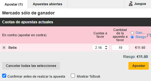 - Si el Betis gana, perderemos 11,60€, que corresponde a la responsabilidad de la apuesta en contra.